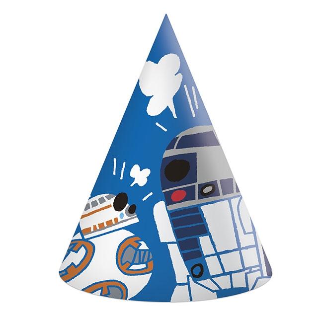 Die Party-Hütchen "Star Wars - Comic Wars" werden im 6er Pack geliefert und bestehen aus Pappe. Für einen guten Halt, ist jedes der ca. 16 cm hohen Hütchen mit einem Gummiband versehen. Bedruckt sind die Hütchen mit R2-D2 und BB-8 im Comicstil.