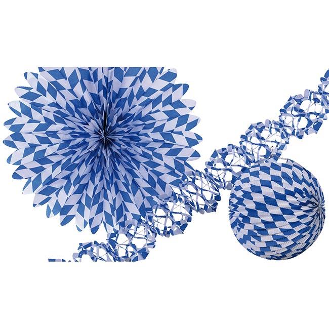 Das 3-tlg. Party-Set "Bayern" ist, wie sollte es anders sein, in blau-weißem Rauten Design gehalten. Das Set besteht aus einer Wabenpapier-Girlande, einem Lampion mit einem Durchmesser von ca. 23,5 cm und einem Wabenpapier-Fächer mit ca. 48 cm Durchmesser. Der Fächer muss selbst entfaltet werden. Der Lampion hat zusätzlich noch einen Kerzenhalter aus Metall mit ca. 1,3 cm Durchmesser und eine Metallaufhängung. Das Set ist schwer entflammbar.