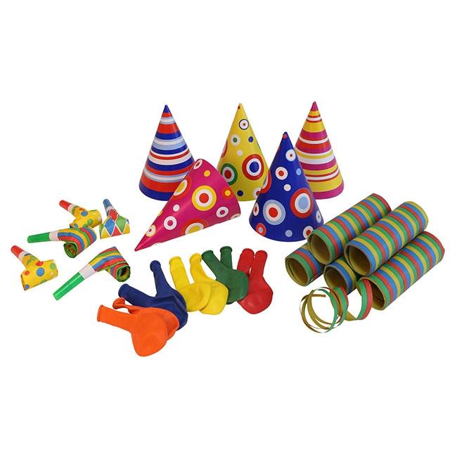 Das Party-Set "Party Basics" ist 25-teilig und besteht aus 10 einfarbigen Latexluftballons (Orange, Blau, Gelb, Grün, Rot), 5 Partyhütchen aus Pappe mit Streifen und bunten Kreisen, 5 Luftrüssel mit bunten Mustern sowie 5 Rollen Luftschlangen (abwechselnd Rot, Grün, Gelb, Blau). Vier Basics die einfach auf keiner Party fehlen dürfen!