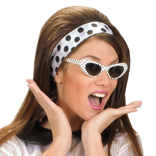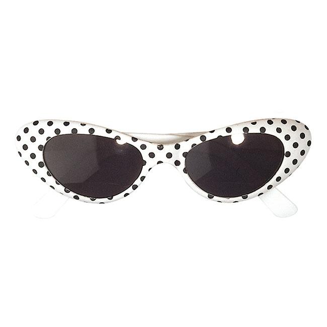 Die Party-Sonnenbrille "50s Girl" besteht aus Kunststoff und hat getönte Kunststoffgläser ohne Sehstärke. Der weiße Rahmen ist, typisch 50er, mit schwarzen Punkten verziert. Es handelt sich um eine Einheitsgröße für Erwachsene. Es handelt sich um einen reinen Partyartikel ohne Sonnenschutzfunktion. Im Lieferumfang enthalten ist ausschließlich die Brille. Andere abgebildete Artikel, wie etwa der Schal, sind NICHT im Lieferumfang enthalten.
