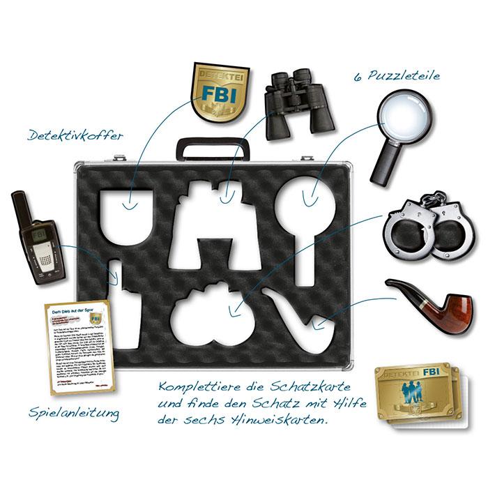Achtung, hier spricht der FBI! Bitte nicht bewegen! Als Detektiv hat man jede Menge zutun, auch bei diesem Party-Spiel. Das Set besteht aus 6 Hinweiskarten, 6 Puzzleteilen, einem Spielbrett und einer Spielanleitung. Ziel ist es, die verloren gegangenen Puzzleteile wieder zu finden und dies geht mit Hilfe der Hinweiskarten, welche natürlich beschriftet werden können. Wer die Motive findet, der bekommt einen ganz tollen Schatz. Und was mag das wohl sein?