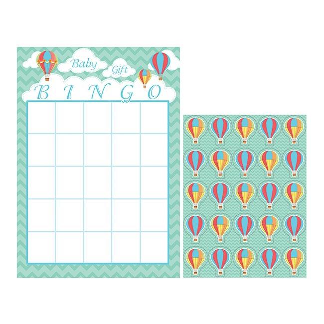 Das Party-Spiel "Hoch in den Wolken" besteht aus Pappe und Papier. Im Lieferumfang sind zehn Bingo-Spielkarten und zehn Blätter mit jeweils 25 Heißluftballon-Stickern enthalten. Diese Sticker haben eine Größe von ca. 2,5 cm. Die Spielkarten mit den freien Feldern sind ca. 21,5 x 15 cm groß und mit "Baby Gift Bingo" beschriftet.