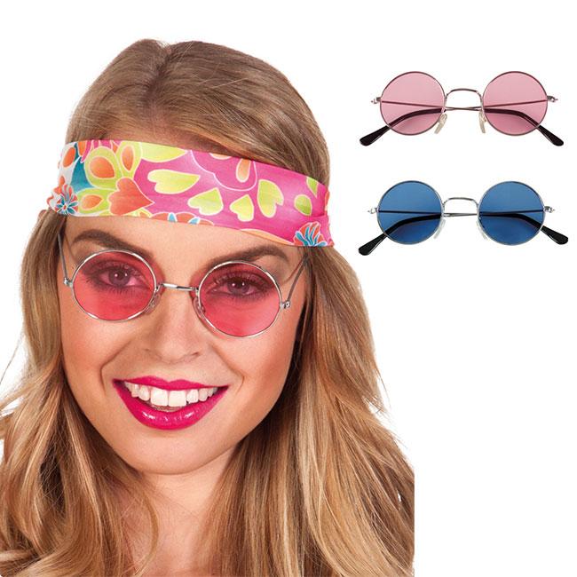 Die Partybrille "Hippie-Style" besteht aus Kunststoff und ist in Erwachsenengröße gefertigt. Die Brille hat ein silberfarbenes Metallic-Gestell, die Bügel sind mit schwarzem Kunststoff überzogen. Die kreisrunden Brillengläser haben einen Durchmesser von ca. 4,5 cm und sind in zwei verschiedenen Farben erhältlich: Pink und Blau. Insgesamt hat die Partybrille eine Breite von ca. 12 cm.