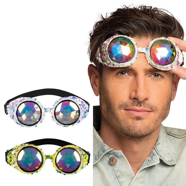 Die Brillen mit den goldenen oder silbernen Pailletten haben eine Breite von ca. 18 cm und sind ca. 6 cm hoch. Sie werden mit einem verstellbaren Gummizug am Kopf befestigt.