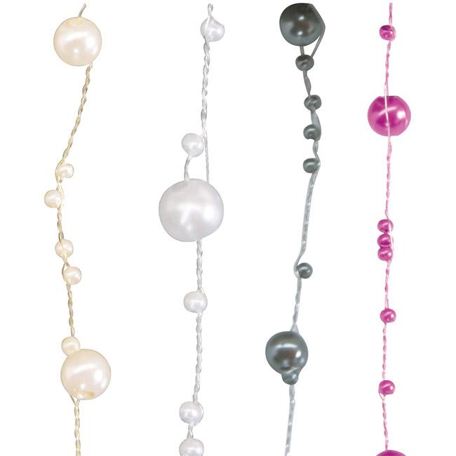 Die Girlande ist aus aneinandergereihten Perlen hergestellt, die an einem biegsamen Draht befestigt sind. Die Girlande hat eine Länge von ca. 5 m und ist in den Farben grau, elfenbein, weiß, oder pink erhältlich.