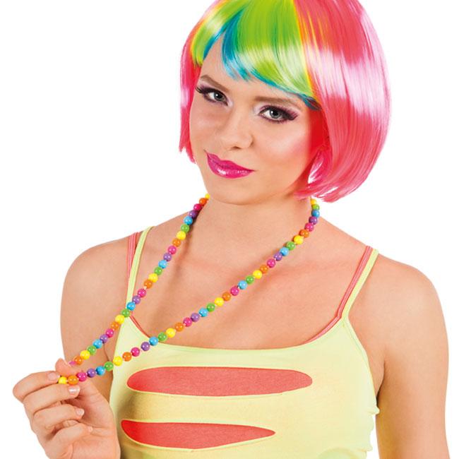 Mit dieser tollen Perlenkette ist man für Karneval, Fasching oder eine Mottoparty bestens gekleidet. Die Perlenkette besteht aus kleinen aneinandergereihten Perlen in verschiedenen Farben. Sie hat eine gesamte Länge von ca. 40 cm und geht bis zur Brust. Die Kette kann mit vielen Outfits kombiniert werden. Sie passt toll zu einer Hippie Party, zu einer 80er Jahre Party und natürlich zum Karneval.
