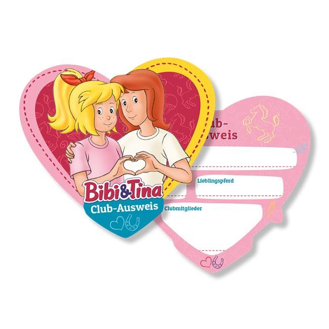 Die personalisierbaren Ausweise "Bibi und Tina" werden im 6er Pack geliefert und bestehen aus beidseitig bedruckter Pappe. Sie sind in Form eines Herzens designt und haben eine Größe von ca. 11 x 10 cm. Auf der Vorderseite sind Bibi und Tina zu sehen, unter ihnen der Schriftzug "Bibi & Tina Club-Ausweis". Auf den Rückseiten der Ausweise sind freie Felder, die Sie selbst beschriften können. Hier können Name, Alter,Lieblingspferd und noch weitere Clubmitglieder eingetragen werden.