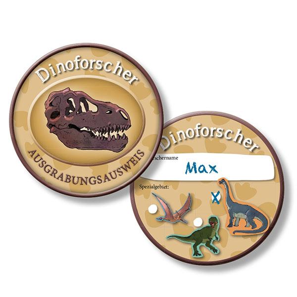 Die personalisierbaren Ausweise "Dinosaurierleben" werden im 6er Pack geliefert. Sie bestehen aus beidseitig bedruckter Pappe und haben einen Durchmesser von ca. 11 cm. Sie können auf der Rückseite des Ausweises nicht nur Ihren Namen eintragen, sondern zusätzlich auch ankreuzen, welche Dinosaurierart Ihrem Spezialgebiet entspricht!