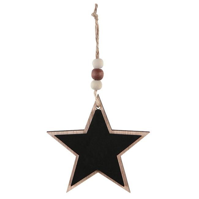 Der personalisierbare Geschenkanhänger "Stern" besteht aus Holz und misst ca. 8 x 8 cm. Auf der Vorderseite ist ein kleinerer Stern (ca. 6,5 x 6,5 cm) mit Tafelfarbe angebracht. Dieser kann individuell mit Kreide oder einem Kreidestift beschriftet werden. Im Lieferumfang ist ausschließlich der Stern enthalten. Ein Jute Band, dekoriert mit Holzperlen, dient der Befestigung.