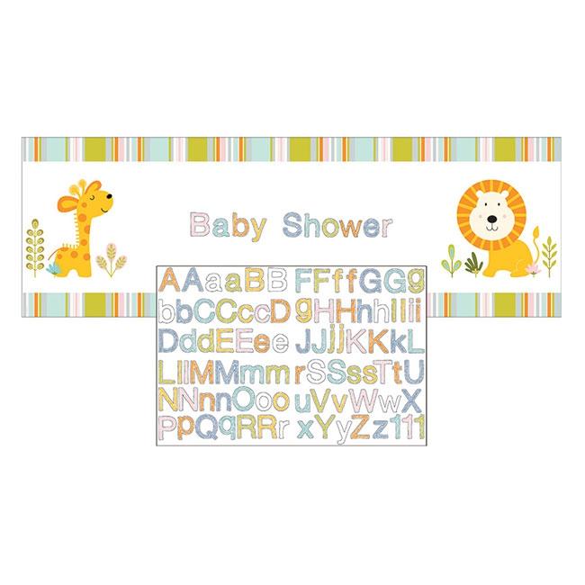 Das personalisierbare Banner "Babys wilde Dschungel Party" umfasst insgesamt 88 Teile. Das Banner besteht aus einer einseitig bedruckten Kunststofffolie die mit einem buntgestreiften Rand, einer Giraffe sowie einem Löwen bedruckt ist. Das ca. 50,8 x 152 cm große Banner kann mit den beiliegenden 87 selbstklebenden Buchstaben (ca. 6,5 cm hoch) individuell beklebt werden. Die Buchstaben sind so designet als wären sie mit Buntstiften gezeichnet worden. Neben dem kompletten Alphabet ist die Zahl 1 dreimal vorhanden.