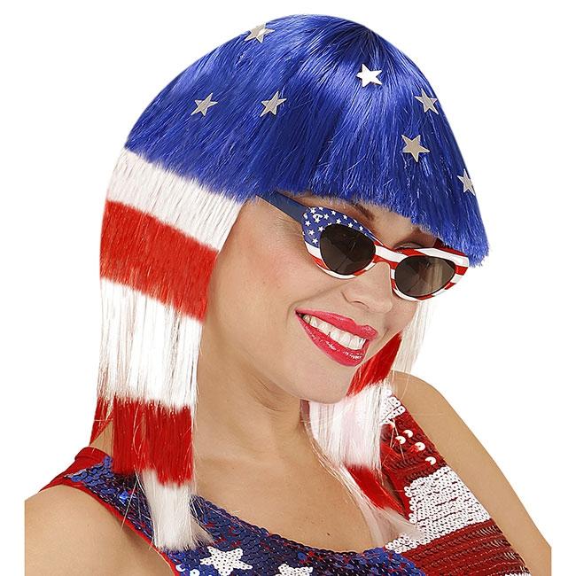 Die Perücke ist ca. schulterlang. Sie ist in der amerikanischen Flagge designet und lässt sich zu allen, passenden Amerika-Outfits kombinieren! Zudem sind silberne Sterne an der Perücke befestigt.