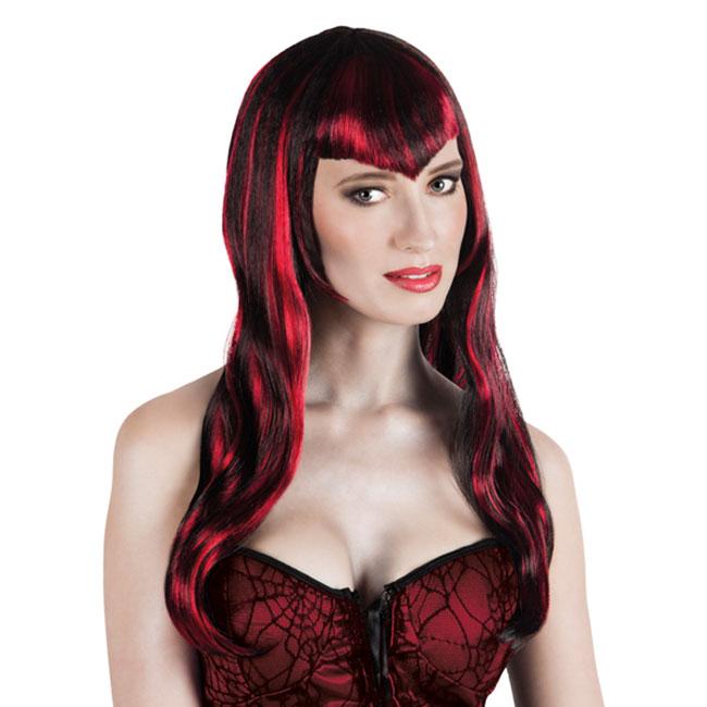 Eine rot-schwarze Perücke mit verführerische Länge - ein absoluter Hingucker! Der Pony ist extravagant geschnitten, denn er verläuft zur Gesichtsmitte spitz. Mit dieser Perücke hat man ein tolles Kostümzubehör für ein edles Vampir Kostüm, welches man bestens für eine Halloweenparty oder eine Horrorparty einsetzen kann. Denn was gibt es Schöneres, als einen zarten, blassen Haut Teint mit roten Lippen?