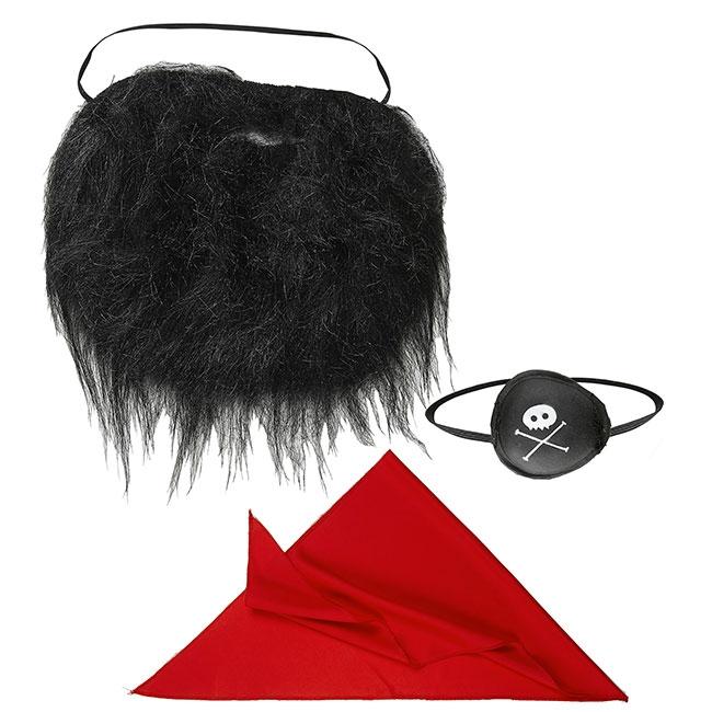 Das Piraten-Set besteht aus drei Teilen und beinhaltet eine Augenklappe, ein rotes Bandana sowie einen Bart- und Schnurrbart. Die Augenklappe kann wahlweise auf dem rechten oder linken Auge getragen werden.