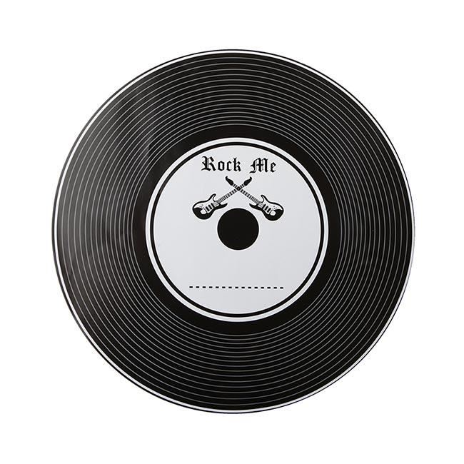 Die Platzsets "Schallplatte" sind zu jeweils 6 Stück abgepackt. Ein Platzset hat einen Durchmesser von ca. 34 cm. Einseitig bedruckt, zeigen die Platzsets den Look einer Schallplatte, mittig sind auf weißer Fläche zwei E-Gitarren abgebildet.