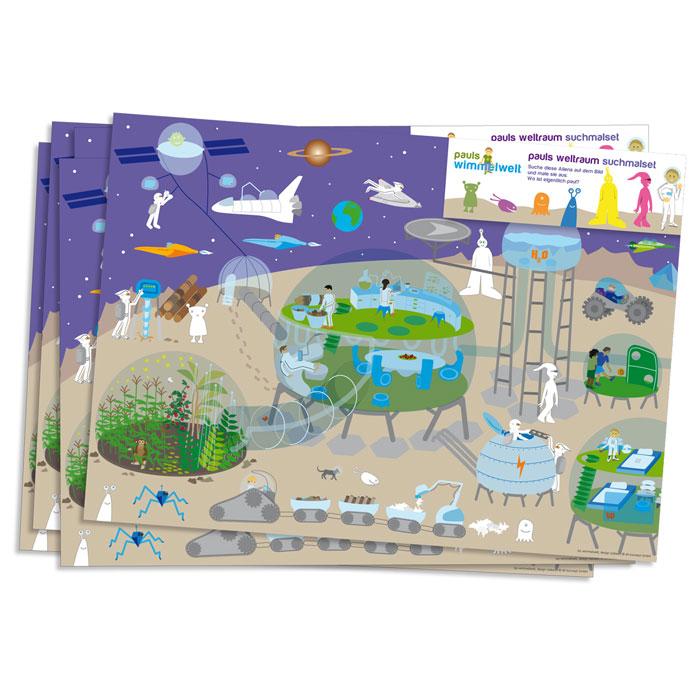 Mehr Info: Diese Platzsets sind mit einer kleinen Aufgabe versehen. Während die Kinder auf das Essen warten können sie gewisse Figuren ausmalen und einen ganz bestimmten Astronauten suchen!