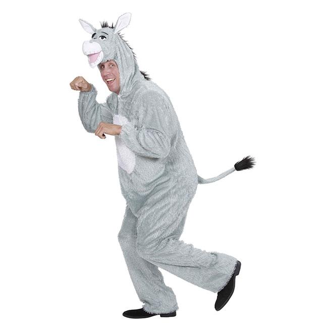 Der Overall besteht aus 100% Polyester und ist in Gestalt eines Esels designet. Über einen Reißverschluss kann das Kostüm geöffnet und geschlossen werden. Das Kostüm ist verfügbar in den Größen M passend für Körpergröße bis ca. 165 cm, L passend für Körpergröße bis ca. 175 cm und XL passend für Körpergröße bis ca. 190 cm.