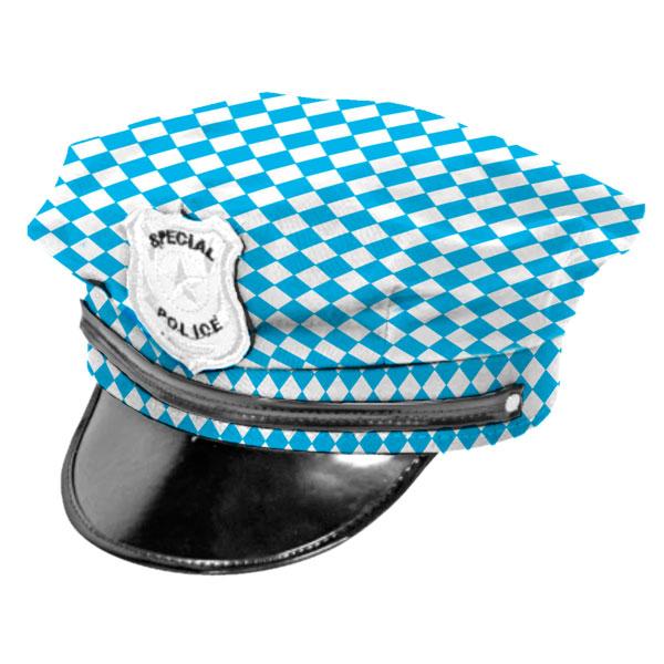 Achtung, hier spricht die bayrische Polizei, wir werden Sie jetzt auf das Oktoberfest begleiten und Ihnen dann zeigen, wie so richtig gefeiert wird! Die Polizei in Bayern geht natürlich während des Dienstes nicht feiern, allerdings können Sie sich eine Polizei-Kappe zulegen, und zwar diese! Die Kappe hat die bayrischen Farben blau-weiß und vorne steht "Special Police" drauf. Die Kappe wird in Einheitsgröße geliefert und ist ein chices Accessoire für Ihr Oktoberfest.