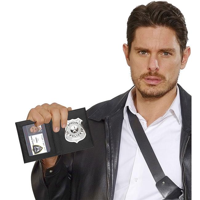 Das Accessoire besteht aus eine schwarzen Börse, die aufgeklappt wird. Darin ist rechts eine silberfarbene Polizeimarke befestigt mit dem Aufdruck "Special Police". Links befindet sich eine Transparent-Tasche für einen Ausweis oder ein Foto. Die Größe der Börse beträgt ca. 9 cm x 10,5 cm.
