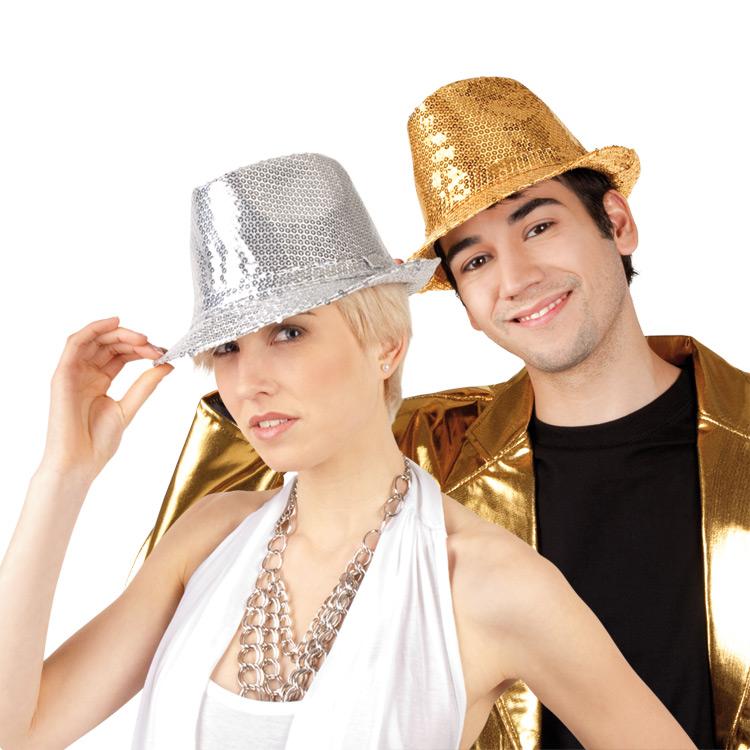 Dieser Hut macht aus jedem einen Popstar! Keine Band, kein Popstar, der ohne diese Art von Hut auskommt. Dieser Popstar-Hut ist mit seinen glitzernden Pailletten eine besonders glamouröse Variante und schickt Sie direkt in die Glanz- und Glamour-Welt. Wir bieten den Hut in den Farben Gold und Silber an. Der Hut ist übersät mit goldenen bzw. silbernen Pailletten, zwischen denen es metallisch in der gewählten Farbe hervorblitzt.