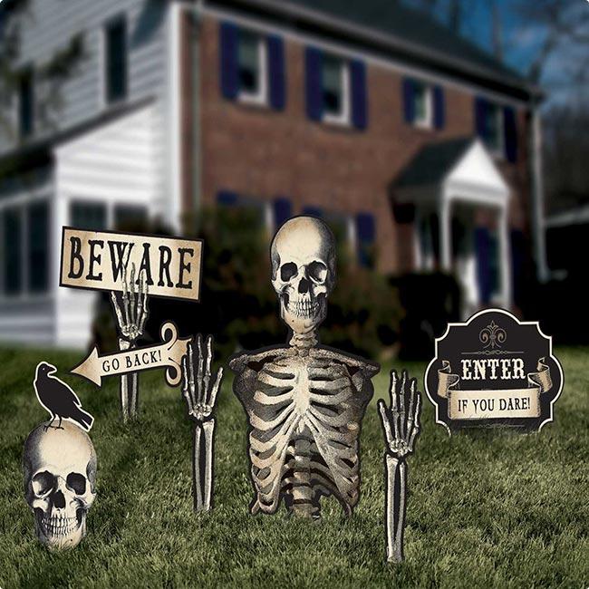 Die Rasendeko "Schaurige Warnung" ist 14-teilig und besteht aus 6 Motiven sowie 8 Metallstäben (ca. 30 cm), die der Fixierung im Rasen dienen. Alle Motive sind einseitig auf stabiler Wellpappe aufgedruckt. Die Größe der Motive variiert zwischen ca. 13,5 x 27 cm (Schädel mit Rabe) und ca. 31 x 50 cm (Torso). Weitere Motive sind 2 Skelettarme, ein Skelettarm, der ein Warnschild hält, sowie ein „Betreten auf eigene Gefahr“-Schild. Alle Motive sind in Schwarz sowie einem hellen Gelbton gehalten, der an schmutzige Knochen und vergilbtes Papier erinnert.