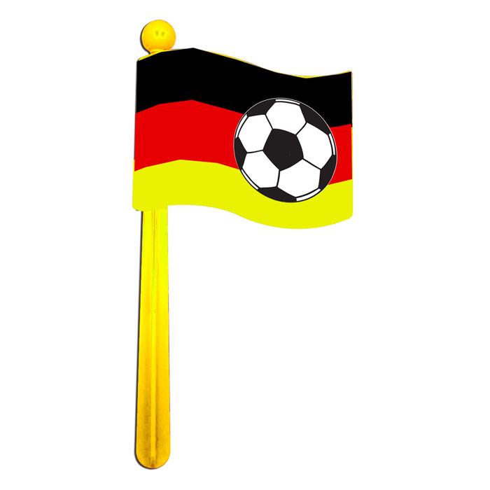 Mehr Info: Diese Fußball-Ratsche wird aus stabilem Kunststoff gefertigt und ist mit Stiel etwa 19 cm hoch. Die Flagge misst etwa 9 x 6,5 cm. Durch Drehen um die eigene Achse wird das rasselnde, knatternde Geräusch erzeugt. Am Stiel ist außerdem eine Schnur befestigt, an der die Rassel befestigt oder z.B. um den Hals gehängt werden kann.