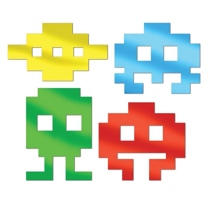 Gelb, Blau, Rot und Grün sind ihre Farben, "pixelig" ihre Figur und Erinnerungen sollten sie bei jedem Kind der 80er Jahre wecken! Denn diese Figuren stehen für die 80er, für die ersten Heimcomputer und die dazugehörigen Spiele. Die Silhouetten "80er Jahre Style" sind vielfältig verwendbar. Die metallische Folie ist beidseitig farbig bedruckt und kann so auch an Fenstern angebracht werden. Wenn sie ein Loch in die Folie stechen, dann kann die Raumdeko sogar mithilfe von Schnüren an die Decke gehängt werden. Natürlich auch für Wände toll geeignet!