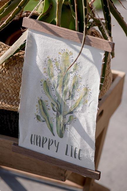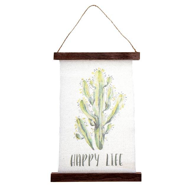 Die Raumdeko "Buntes Peru" hat eine Länge von ca. 32 cm. Zwischen zwei schmale Holzplatten ist ein ca. 28,5 cm langes und ca. 20 cm breites Stück Polyester-Stoff in Leinen-Optik gespannt. Die Rückseite ist nicht bedruckt und auf der Vorderseite ist ein Kaktus, zusammen mit dem Schriftzug "Happy Life", aufgedruckt. An der Raumdeko ist eine Kordel befestigt, mit der Sie die Deko ganz bequem an der Wand befestigen können.