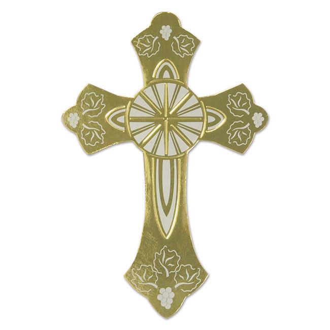 Das kleine Goldkreuz ist ca. 17 cm lang und ca. 11,5 cm breit. Es besteht aus beidseitig bedruckter, gold beschichteter Pappe und hat kleine Weinblätter und Trauben als bedruckte Verzierung an den Seiten. Durch diese silbernen Verzierungen wirkt es sehr edel. Das Kreuz kann als Wand oder Fensterdeko verwendet werden.