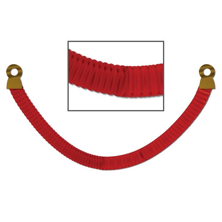 Mehr Info: Die Aufhänger dieser Raumdeko sind aus metallisch glänzender Pappe gefertigt, die eigentliche "Schnur" besteht aus einer roten Papier-Girlande aus Wabenpapier. Vollständig entfaltet, überbrückt die Deko gut 2,4 m Länge. Wieder zusammengefaltet kann sie sehr platzsparend verstaut werden.