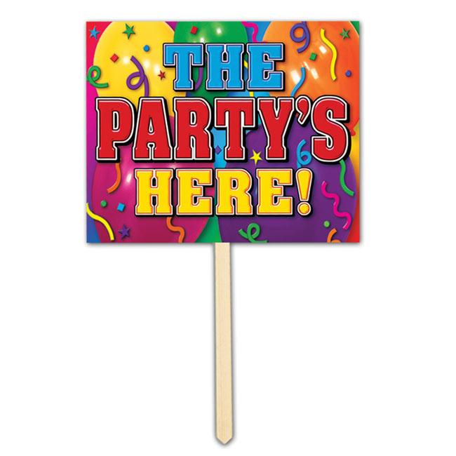 Dieses Schild sagt einfach alles: The Party's here - was so viel heißt wie die Party findet hier statt! Es kann durch die Gegend getragen werden, oder in der Erde oder in Blumenkästen gesteckt werden. Das Schild hat eine gesamte Höhe von ca. 60 cm und eine Breite von ca. 38 cm. Das Schild besteht aus Pappe, ist beidseitig bedruckt und bunt. Die Größe beträgt ca. 38 x 31 cm. Es ist an einem robusten Holzstab befestigt. Da kann die Party ja starten!