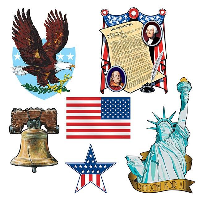 Die Wanddeko "Wahrzeichen USA" wird 6-teilig geliefert und besteht aus beidseitig bedruckter Pappe. Die Höhe der Motive variiert von ca. 20 - 47 cm. Es sind 6 verschiedene Motive im Lieferumfang enthalten, die Freiheitsstatue, die amerikanische Flagge, die Liberty-Bell, der Weißkopf-Seeadler, die Unabhängigkeitserklärung und ein Stern. Da die Wanddeko beidseitig bedruckt ist, können Sie sie auch frei im Raum aufhängen.