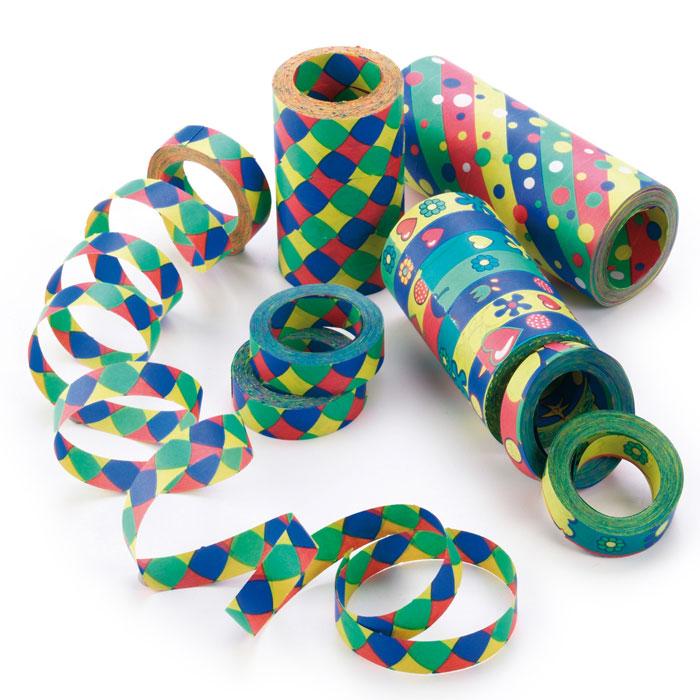 Mehr Info: Dieses 3er Pack beeinhaltet eine Luftschlangenrolle mit bunten Rauten, eine Rolle mit bunten Querstreifen und Punkten und auf der dritten sind auf buntem Hintergrund viele ebenfalls bunten Symbole: unter anderem Sonnen, Blumen und Sterne.