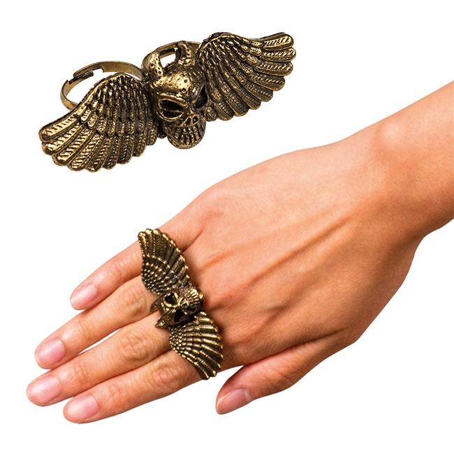 Der Ring "Dämon" besteht aus Metall und wird in einer Einheitsgröße für Erwachsene geliefert. Als Motiv zeigt er den gehörnten, goldfarbenen Schädel eines Dämons mit schwarzen Augen und Flügeln. Die Breite beträgt ca. 6,5 cm.