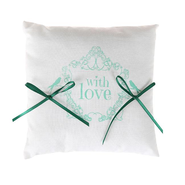 Das Ringkissen "With love" besteht aus Baumwolle und hat eine Größe von ca. 18 x 18 cm. Je nach Auswahl ist es rosa und weiß oder grün und weiß. Das weiße Kissen ist mit der Aufschrift "with love" bedruckt, die von einem verschnörkeltem Muster umrahmt wird. Zusätzlich sind auf dem Kissen zwei Schleifen angebracht, an denen die Ringe befestigt werden können.