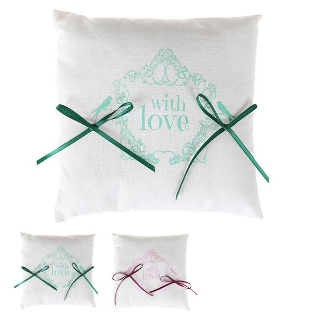 Das Ringkissen "With love" besteht aus Baumwolle und hat eine Größe von ca. 18 x 18 cm. Je nach Auswahl ist es rosa und weiß oder grün und weiß. Das weiße Kissen ist mit der Aufschrift "with love" bedruckt, die von einem verschnörkeltem Muster umrahmt wird. Zusätzlich sind auf dem Kissen zwei Schleifen angebracht, an denen die Ringe befestigt werden können.