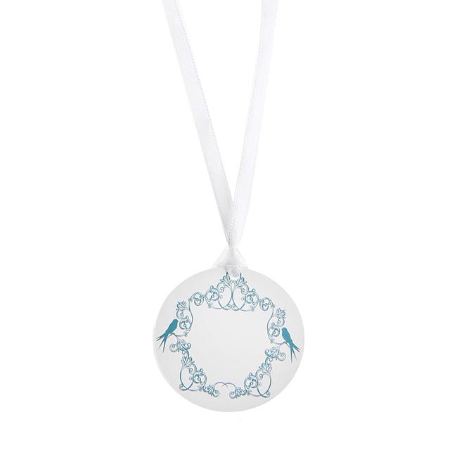 Die runden Namenskarten "With love" bestehen aus beidseitig bedruckter Pappe und werden im 12er Pack geliefert. Sie haben einen Durchmesser von ca. 4,6 cm und sind, je nach Auswahl, weiß und blau oder weiß und pink. An jedem Namenskärtchen befindet sich ein weißes Satinband, sodass die Kärtchen auch um ein Glas gebunden werden können. Vergessen Sie nicht, die Kärtchen davor noch mit Namen zu versehen!