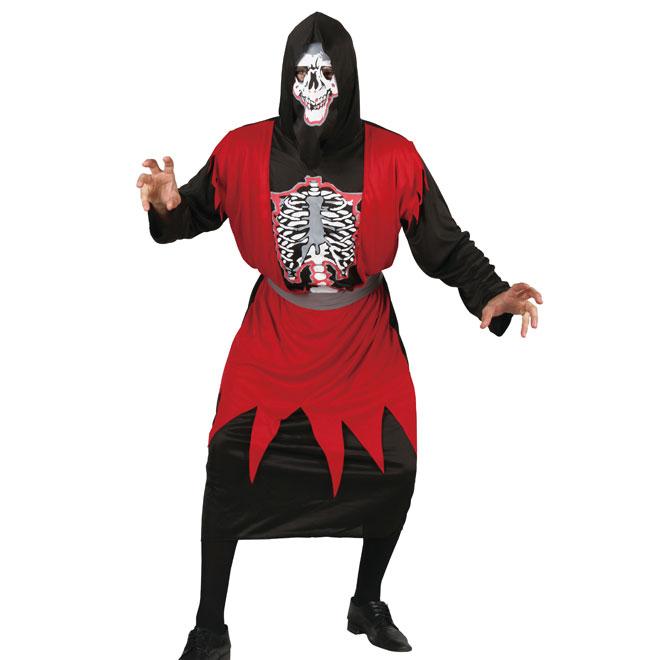 Wenn Sie auch Liebhaber von Kostümen mit Masken sind, wäre dieses Kostüm für Sie genau das Richtige. Hinter der Maske wird man Sie mit großer Wahrscheinlichkeit nicht erkennen, nicht mal Ihre Frau! Die Maske zeigt die Fratze eines Skeletts, Blutunterlaufen und auch am Brustkorb sieht man die Knochen der Rippen und Wirbelsäule! Die Toga besteht aus zwei Lagen. Lange Ärmel in schwarz runden das ganze ab und machen das Kostüm vollkommen.