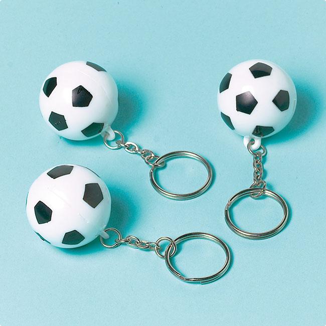 Die Schlüsselanhänger "Fußball" werden im 12er Pack geliefert und bestehen aus Metall und Kunststoff. Die Fußbälle haben eine Größe von ca. 3 cm.