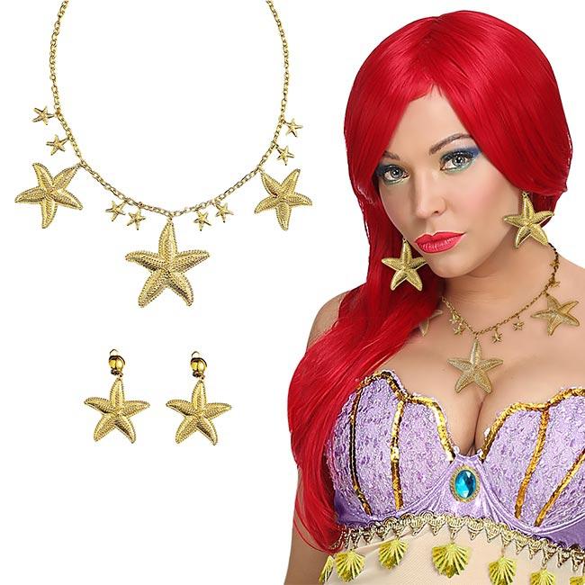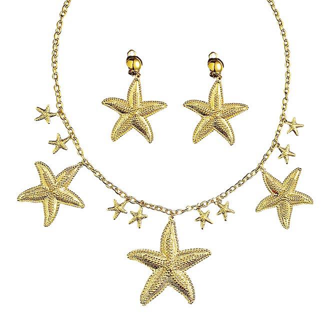 Das goldfarbene Schmuck-Set "Meerjungfrau" umfasst drei Teile: Eine Halskette und ein Paar Clips-Ohrringe. Sie bestehen aus Kunststoff und sind mit verschieden großen Seesternen versehen. Die Größe der Seesterne an den Ohrringen beträgt ca. 5 cm, die der Seesterne an der Halskette variiert von ca. 1,5 - 6,5 cm.