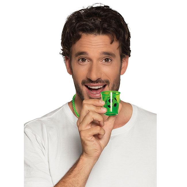 Das Schnapsglas "Fußball" ist ca. 5,8 cm hoch und besteht aus grünem Kunststoff. Bedruckt ist es mit einem schwarzen Fußball. Praktischerweise kann man das Glas immer an der ca. 40 cm langen grünen Perlenketten mit sich herumtragen und hat es so immer griffbereit.