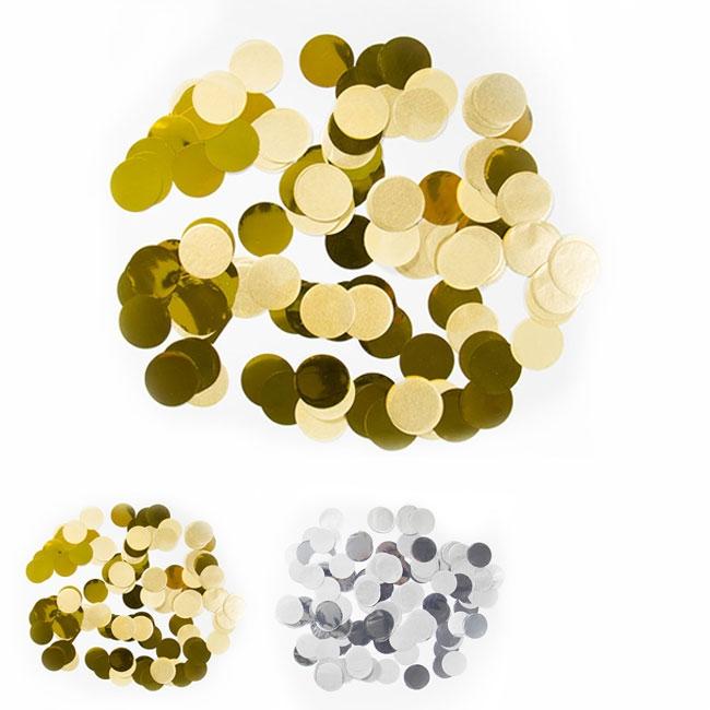 Das Seidenpapier-Konfetti "Metallic Moments" wird im 14 g Beutel geliefert. Es kann, je nach Auswahl, zwischen den Farben Gold oder Silber gewählt werden. Der Beutel ist nicht nur üppig mit rundem Seidenpapier-Konfetti in der gewählten Farbe gefüllt, sondern auch mit gleichfarbigem Konfetti aus metallischer Folie. Der Durchmesser des Konfettis beträgt ca. 2,5 cm.