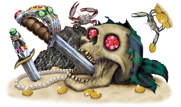 Die selbstklebende Wanddeko Rubin-Totenkopf ist eine schaurig-schöne Partydeko für Ihre Mottoparty. Diese Wanddeko besteht aus zwei Teilen. Auf der ersten Klebefolie sieht man einen Totenkopf mit Rubinaugen und zwei mit Edelsteinen besetzte Dolche. Die zweite Folie zeigt einen Krebs mit Münzen.
