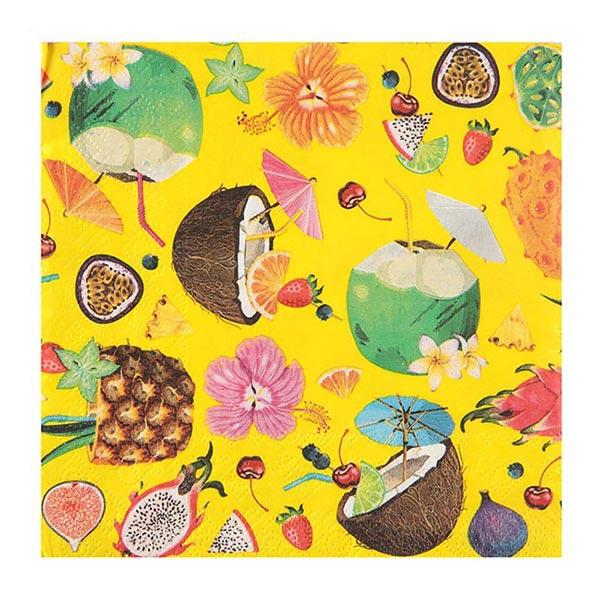 Die Servietten "Cocktail Party" werden im 20er Pack geliefert. Sie bestehen aus Papier und haben aufgefaltet eine Größe von ca. 33 x 33 cm. Das knallige Gelb, die bunten Cocktails und Blumen sorgen nicht nur für die nötige Portion Farbe auf dem gedeckten Tisch, sondern auch für sommerliche Ferienlaune.