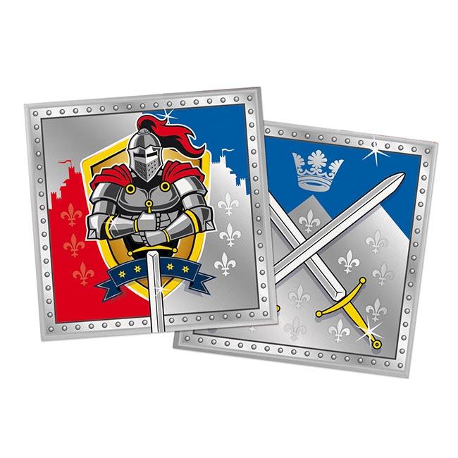 Die Servietten "Edler Ritter" bestehen aus Papier und werden im 20er Pack geliefert. Aufgefaltet haben sie eine Größe von ca. 33 x 33 cm. Auf ihnen sind zwei gekreuzte Schwerter oder ein Ritter in glänzender Rüstung vor einem Wappen abgebildet.