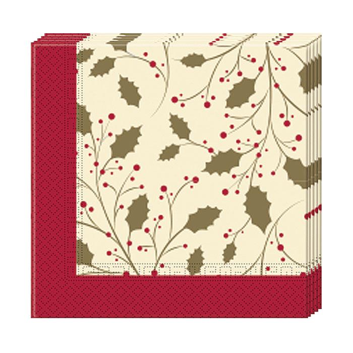 Die Servietten "Goldene Weihnachtszeit" bestehen aus 3-lagigem Papier, haben einen geprägten Rand und werden im 20er Pack geliefert. Gefaltet haben sie eine Größe von ca. 16,5 x 16,5 cm, entfaltet sind sie ca. 33 x 33 cm groß. Passend zu Weihnachten sind sie mit einem roten Rand bedruckt. Die Mitte ist beige und mit goldenen Stechpalmenzweigen und roten Beeren bedruckt.