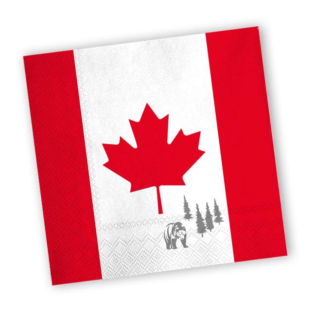 Die Servietten "Kanada" bestehen aus Papier und haben aufgefaltet eine Größe von ca. 33 x 33 cm. Sie wurden im Kanada-Design gestaltet und zeigen nicht nur die kanadische Flagge, sondern auch einen Bären und vier Tannen.