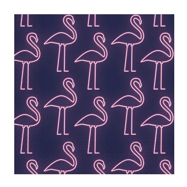 Die Servietten der Serie Neon sind aus 2-lagigem Papier gefertigt und werden im 20er Pack angeboten. Sie haben entfaltet ein Maß von 33 x 33 cm, gefaltet das Standardmaß von 16,5 x 16,5 cm. Abgebildet ist ein pink-weißer Flamingo auf lila Hintergrund.