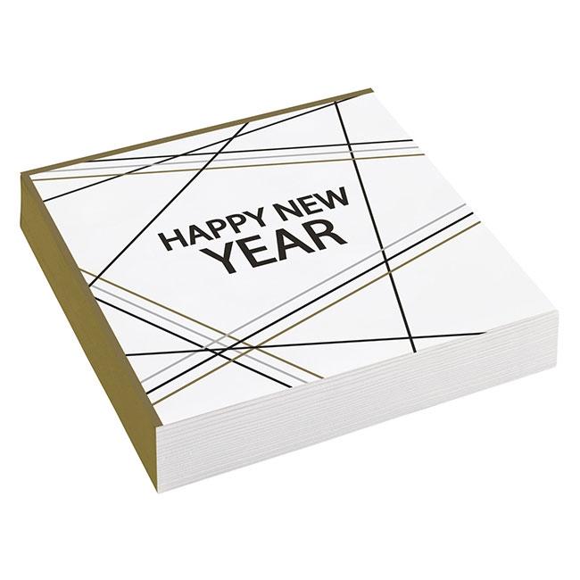 Die modernen Servietten "New Year Celebration" werden im 20er Pack geliefert. Bedruckt sind die dreilagigen, weißen Servietten mit einem dünnen goldenen Rand, sowie dünnen Streifen in Gold, Silber und Schwarz. In schlichten schwarzen Buchstaben prangt mittig der Satz „Happy New Year“. Der Rand der Servietten ist geprägt. Gefaltet haben die Servietten eine Größe von ca. 16,5 x 16,5 cm (entfaltet ca. 33 x 33 cm).