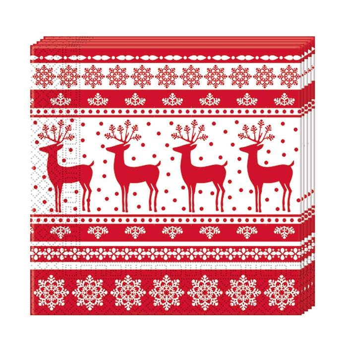 Die Servietten "Niedliche Rentiere" werden im 20er Pack geliefert, sind 3-lagig und haben einen geprägten Rand. Das rot-weiße Design zeigt Rehe mit filigranen Geweihen, verschnörkelte Eiskristalle und andere Muster. Gefaltet haben die Servietten eine Größe von ca. 16,5 x 16,5 cm, entfaltet sind sie ca. 33 x 33 cm groß.