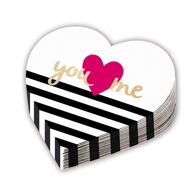 Die Servietten "Nur du und ich" werden im 12er Pack geliefert und sind dreilagig. Das Besondere ist ihre Form, nämlich die eines Herz. Gefaltet sind die Servietten ca. 15,5 x 15,5 cm, entfaltet ca. 31 x 31 cm. Neben schwarz-weißen Streifen, ziert die Servietten außerdem ein pinkes Herz und die goldenen Worte "you" und "me".